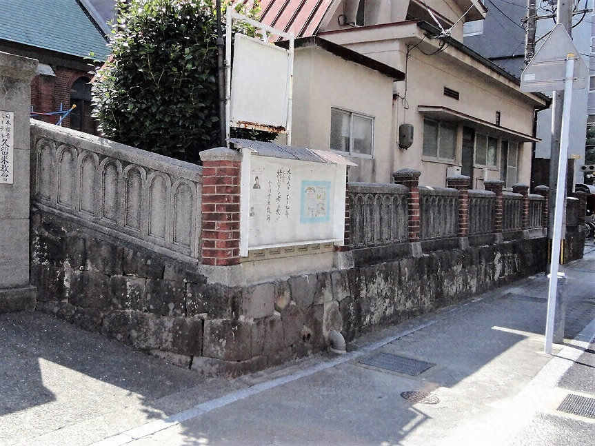 敷地北面の街路沿いに建つ。煉瓦造、基礎切石積で、敷地中央部を後退して正門を設ける。モルタル笠木付の煉瓦長手積角柱を等間隔に並べ、柱間の塀をモルタル塗とし、壁面に7連アーチ、上端に笠木を表す。礼拝堂と調和し、整然とした表構えを形成している。