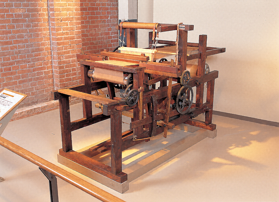 1892年三重県の松田繁次郎が足踏織機の特許を取得し、手を使わず足で踏木を踏む操作により、開口、よこ入れ、筬打ちの三つの運動を行わせる織機です。これは動力織機に通じるもので、特筆される発明でした。また第二次世界大戦後まで、遠州地方をはじめとする機業地の中小織布工場などで、運転費用の安い織機として使われていました。
