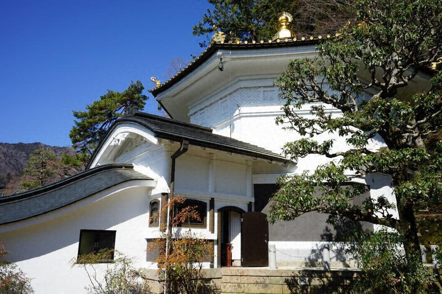 仏殿西側の傾斜地に建つ前室廊下付の八角円堂で、外部漆喰塗で東西に唐破風付窓を付す。八角平面の内陣須弥壇に金色の宝塔を安置する。周囲の入側に天女等の彫刻を施した海老虹梁を架ける。軸部、組物、彫刻とも金箔や極彩色を施し、格別な荘厳の堂内を創る。