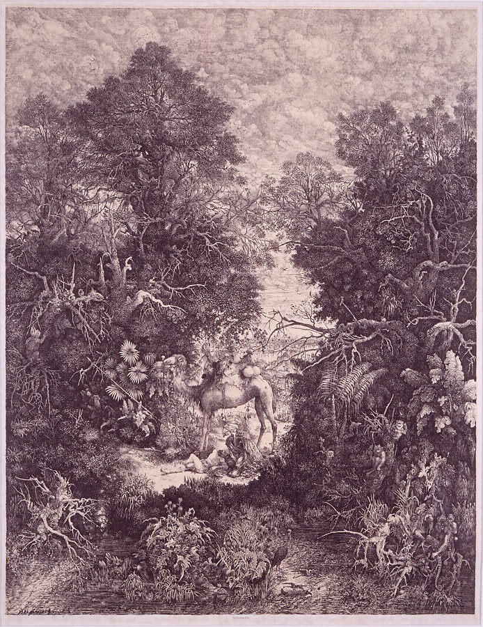 鬱蒼とした森に光が射し、荷を積んだ一頭のラクダを照らし出す。ラクダの足元に描かれるのは、身ぐるみ剥がれ横たわる男と、彼をのぞき込むもう一人の男。周囲には植物が過剰なまでに繁茂し、茂みから生き物が顔をのぞかせている。