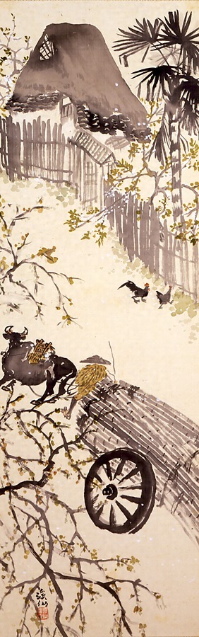 一軒の農家があって、垣根の前では鶏が二羽戯れている。その付近を牛車が通りかかっている。画面に描かれたものは何気ない一田舎の風景であり、当時とすれば、どこにでも見受けられる情景であったに違いない。