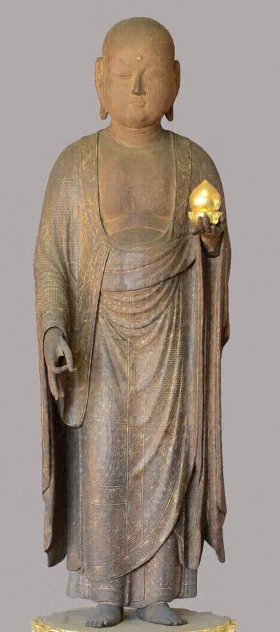 左手を屈臂して掌に宝珠を載せ、右手は垂下して錫杖を執り、蓮華座上に立つ。頭部は剃髪の円頂無冠の僧形で、髪際をあらわさない。顔は卵型で、眉は段差であらわす。両目は彫眼、伏し目がちで見開きが小さく、左目は目を閉じているようにも見える。鼻は小さく丸みを帯び、鼻孔をつくる。口は小さく、口の下に頤を盛り上げる。耳垂部環状、貫通。三道相をあらわす。上半身には覆肩衣を着け、下半身に裙を履き、その上から袈裟を偏袒右肩にまとう。光背は輪光とし、3箇所に宝珠を配する。台座は方形の框座の上に、岩座、蓮華座の順に重ねる。框座の上面には波頭と流水文を描き、岩座は青や水色で彩色される。
