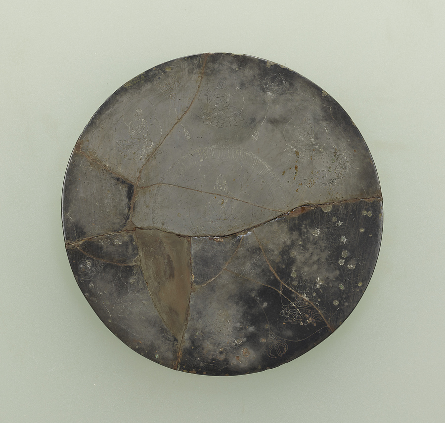 鏡像の成立背景のひとつに、密教における観想(円相の中に仏の姿を想い描く)が関わるとする考え方がある。この作品は中国製の唐鏡(とうきょう)の鏡面に、大日如来を中心とする胎蔵曼荼羅(たいぞうまんだら)の中台八葉院(ちゅうだいはちよういん)を線刻しており、鏡像成立初期の様相を伝えるものとして貴重である。(20120228_h131)