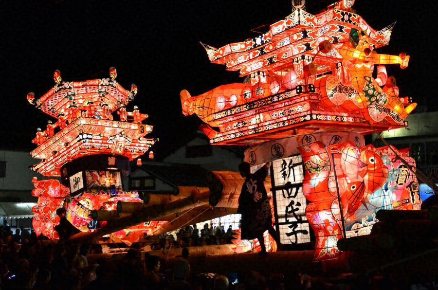 行燈の制作時期は各自治会により異なるが、多くの自治会では2月から3月に制作が開始される。行燈の骨組は、最初に軸となる木枠を組んで、その周囲に細く割った竹で形をつくる。その後、照明の電気配線等を行い、和紙貼り、下書き、蝋引き、色塗りの各工程を経て完成する。祭りの約2週間前頃には、「台締め」と呼ばれる行燈を乗せる基台の組み立てが行われる。さらに祭りの前日もしくは当日には、クレーン車等で基台の上に心木を立て、各行燈部品を取り付ける「組上げ」が行われる。