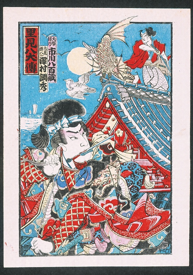 石版画。役者見立絵。信乃(市川八百蔵)と現八(沢村調秀)の芳流閣上の決闘。