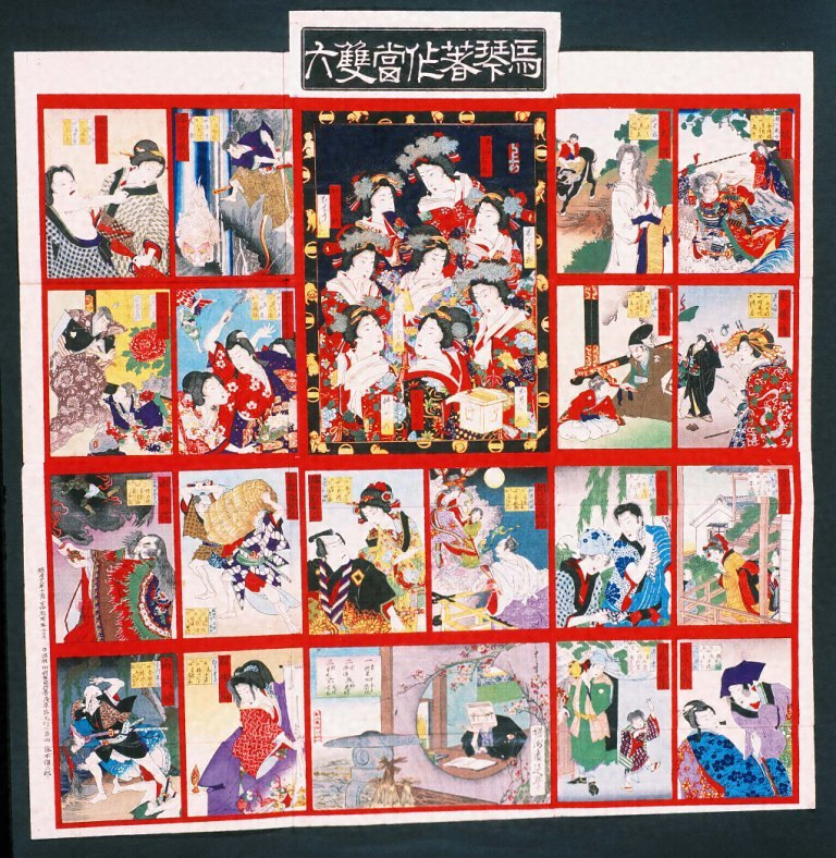 馬琴の著名な18作品を双六に仕立てた。八犬伝は富山の伏姫を描き、上がりに里見義成の8人の姫を配している。