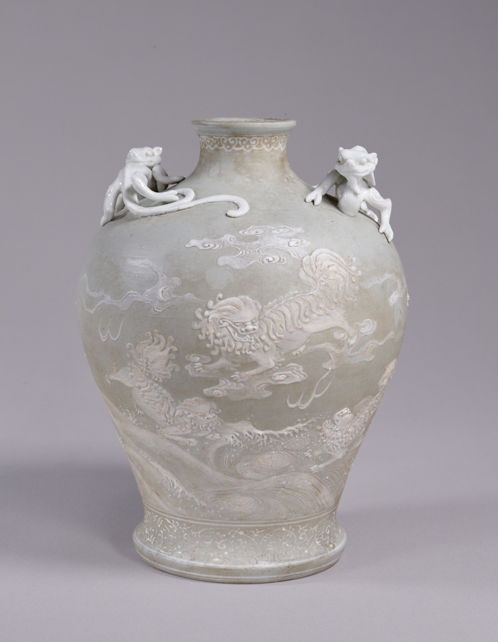 青地白堆波涛に獅子図龍耳瓶