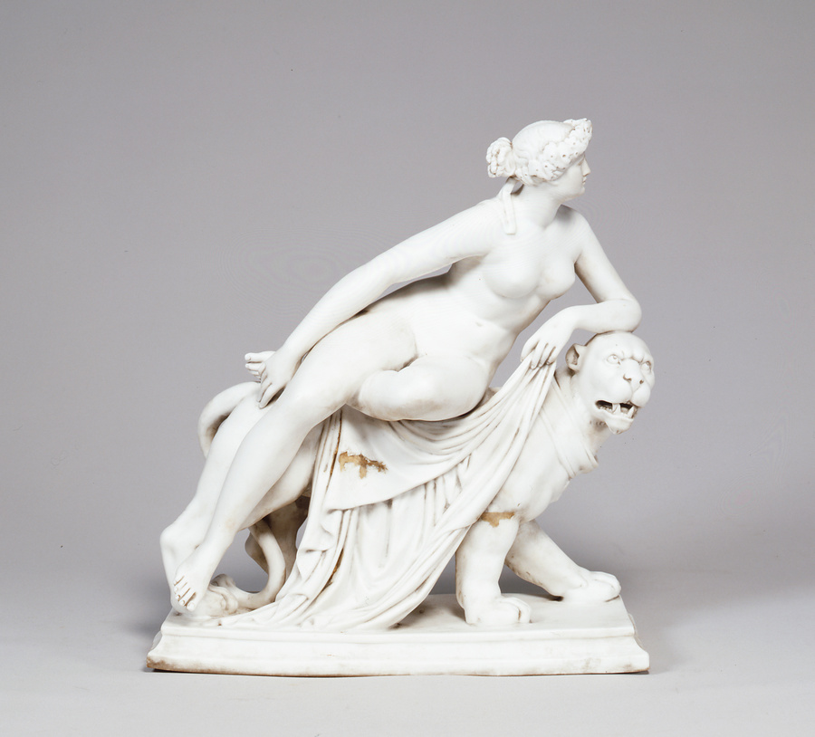 アリアドネは、ヒョウの牽く戦車に乗って現れた酒神ディオニュソスと結ばれました。ヒョウとブドウの葉の冠は、ディオニュソスを象徴します。