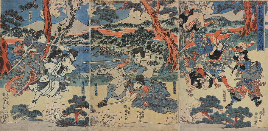 「箱根霊験躄仇討」の終盤、勝五郎たちが仇敵滝口上野を追い詰める場面です。物語では、死後に滝に打たれて夫の仇討を成就させる初花ですが、作品では場面を盛り上げるためか、人質として描かれています。そのため、勝五郎とともに立ち向かう女性は初花の母早蕨です。箱根権現のある芦ノ湖が舞台となっており、滝口の後ろには賽の河原も描かれています。