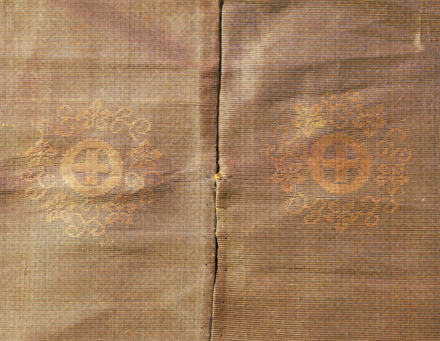 直垂は武士が着用する礼装の一種で広袖の上衣と袴(はかま)のスーツ。鎧直垂は、鎧の下に着用できるように動きやすく仕立てられている。経(たて)糸(いと)3本を捩(もじ)った薄手の透ける紗(しゃ)地(じ)に、綾(あや)織(おり)で文様を織り出した顕紋紗は、夏向きで涼しげである。十字丸紋の家紋を織り出している。 (2007/06/19_h05)