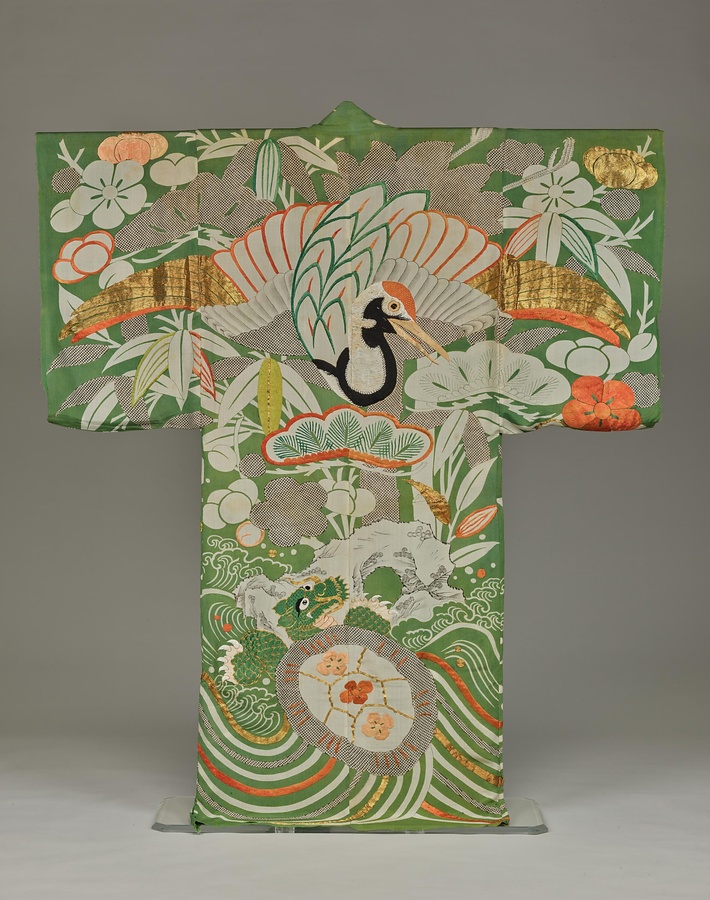夜着とは江戸時代の布団で、着物の形をしています。眠っている間に魔物にとり憑(つ)かれないようにという思いから吉祥模様で表現されることが多いです。鶴亀は長生きであることから、縁起物として夜着模様として喜ばれました。