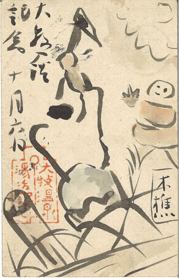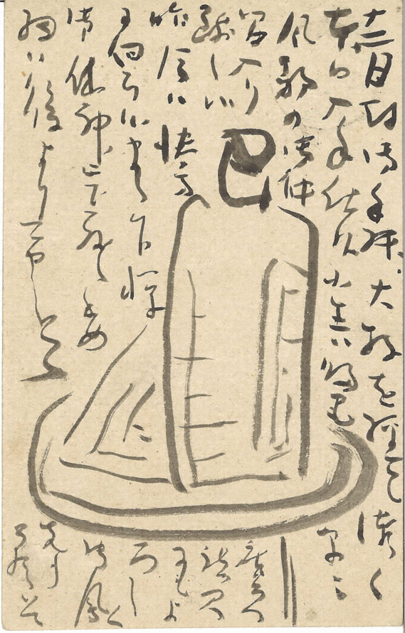 大牧滞在後投函のハガキ。風邪をひいているとあるので寝床にいる自身を描いたものか。自在に筆を使い、速度のはやい軽妙な線で上半身が大きくデフォルメされた略筆の墨画である。書も早書きで筆圧は弱く文字と絵のバランスに安定感がある。