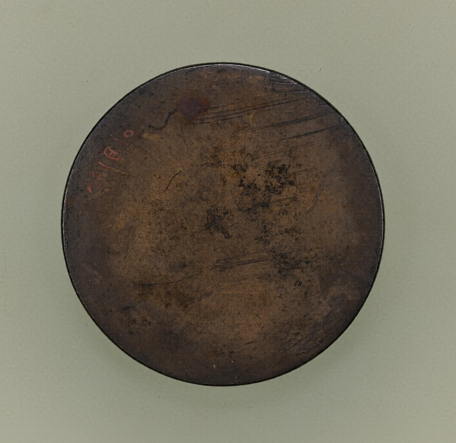 羽黒鏡は出羽三山神社前(山形県羽黒山)の御手洗池より発見された一群の鏡を指し、祈願のため投じられた説がある。池中にあったため光沢を帯びた独特の暗黒色を呈し、柔らかにあらわされた花鳥文様が平安時代の繊細優美な好尚を伝えている。(20070227_h032)