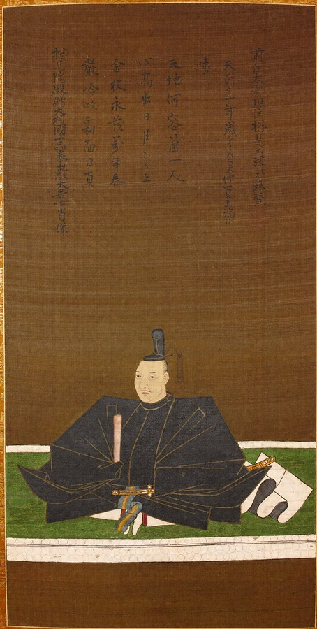賛:古溪宗陳「捴見院殿贈大相國一品㤗巖大居士肖像/厳冷吹霜面目真/金枝永茂萬年春/心髙出日月之上/天地何容箇一人/咦/天正十一年歳矣癸未仲夏上浣日/前住大徳現住捴見古溪老拙賛」「古溪」(朱文壺印)