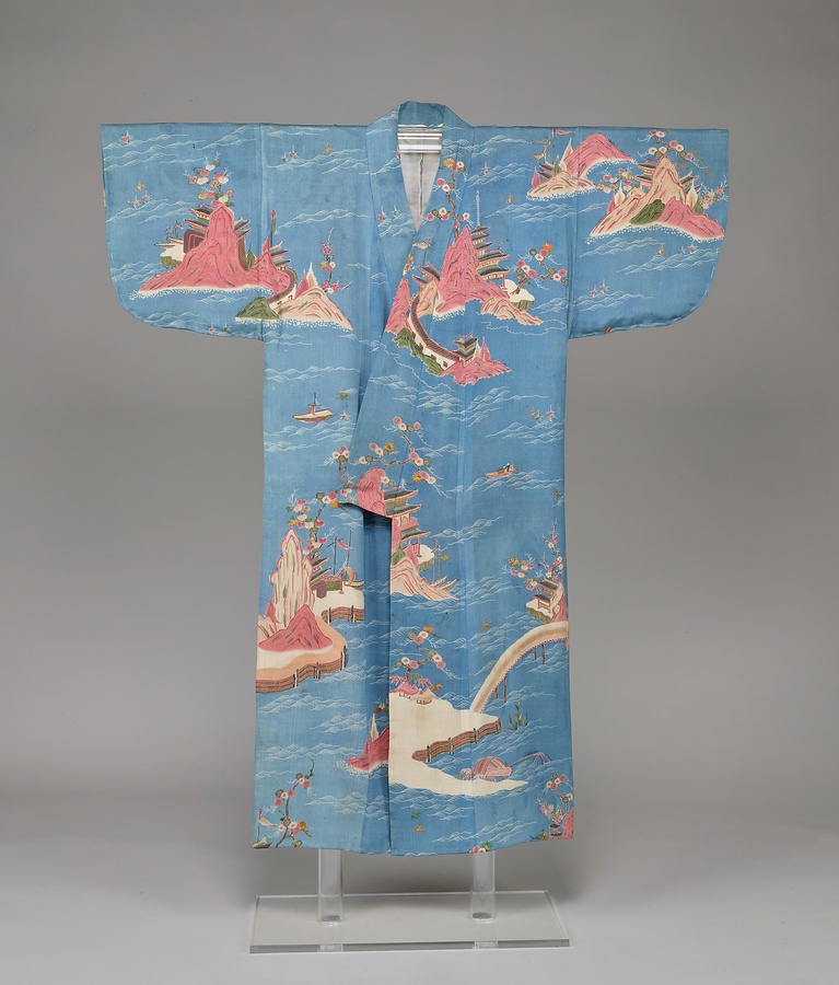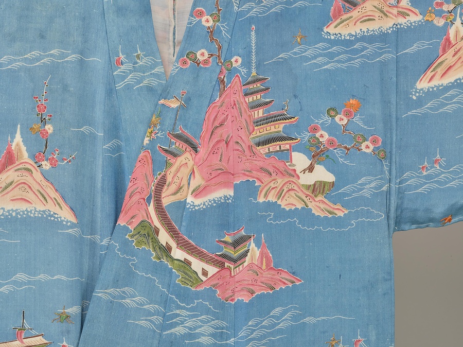 縮緬地を縹色に染め波模様を白上げにして、小高い島にさまざまな唐様の楼閣を友禅染で表わした風景模様の小袖です。鮮やかな発色の赤紫色は江戸時代中期における友禅染の特徴で、輸入染料である生臙脂で染めています。暈しや細い糊置きで細部を描いた最盛期の友禅染です。