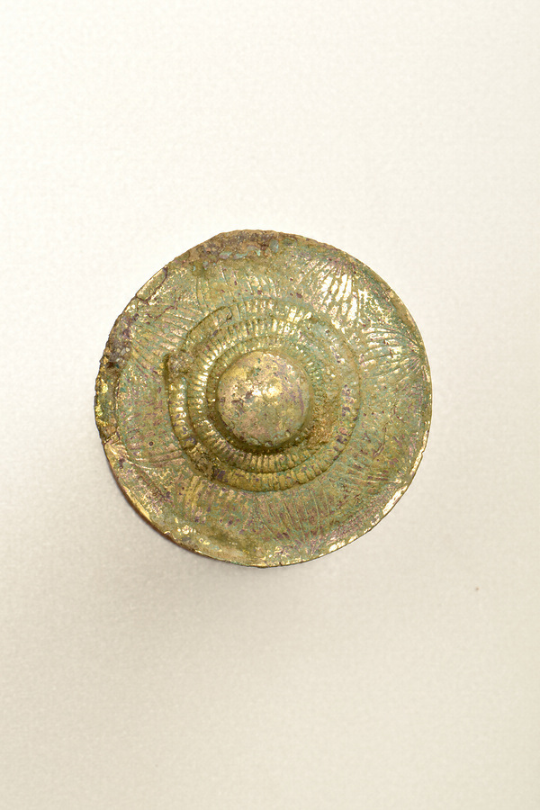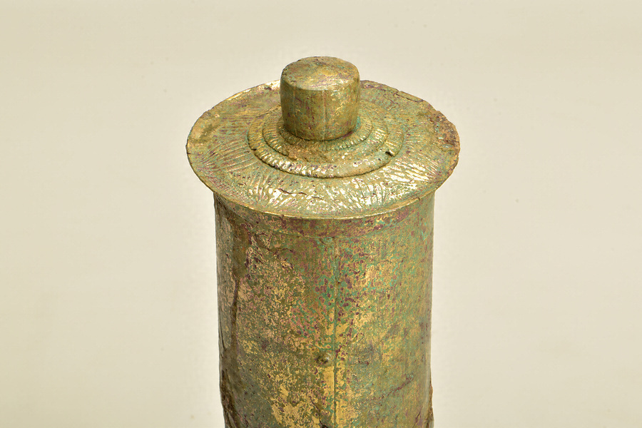 銅板製鍍金経筒は、薄い銅板を丸めて5本の鋲で接合し、円筒に成形しています。蓋は傘蓋式と呼ばれ、表面には蓮華文が刻まれています。経筒の表面全体に鍍金が施されており、令和2年度に実施した保存修復作業によって、製作当時の黄金の輝きがよみがえりました。底の部分は腐食して欠失しており、木製の底板は後補のものです。