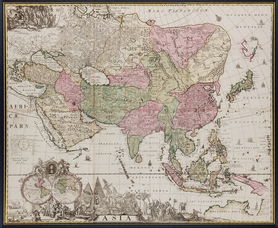 6枚の銅版画を合わせた壁掛け用の大型アジア地図。本来は、ヨーロッパ・アフリカ・アメリカの大陸図と、さらに世界地図が加わって5枚一組の図となります。このような地図は、フェルメールの絵にあるように、室内の壁に掛けて見るため朽ちるのが早いため世界的にも現存数は多くありません。作者のG.ファルクはアムステルダムの地図製作者で、息子のL.ファルクと共同して多くの地球儀と地図を製作しました。
