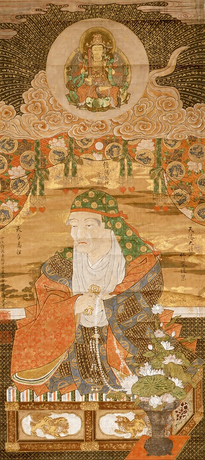 天海は江戸時代初期の天台宗の僧。箱書には「慈眼大師真像 一軸」とある。作者の覚範は弘前の薬王院十三世で、弘前藩九代藩主寧親に重用された。箱書は覚範自身により、文政三年に本像の開眼供養した後、文政五年に藩主寧親の賛を得たとある。