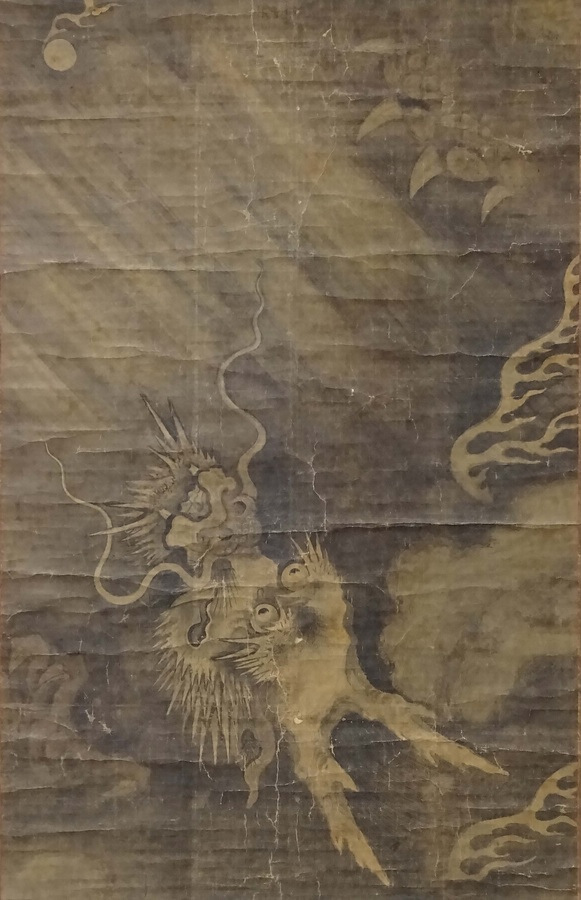 雲の中から空を仰ぐ大幅の龍図である。極2枚が付属する。大正期までの毛利家の道具帳に記載があり、昭和期に流出したものと推測される。