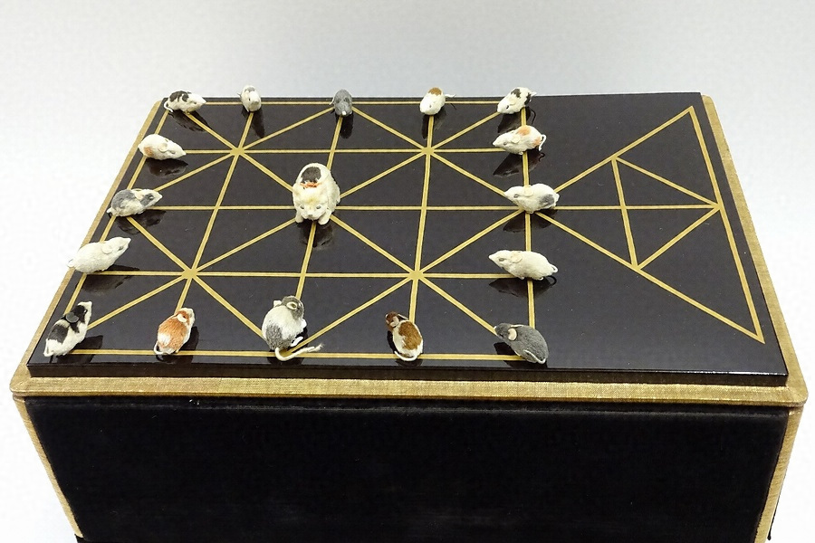 弘前城中で使用されたと伝わる遊戯具。盤面は黒漆塗りに蒔絵で線を引き、駒は毛植人形の猫と鼠である。細い絹糸を植え付けた毛植人形は、幕末から明治初めに京都で作られた人形と言われており、本品もその頃の制作と考えられる。明治2年に京都から当地に下った最後の藩主夫人近衛尹子のゆかりの品と推測される。