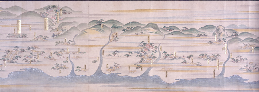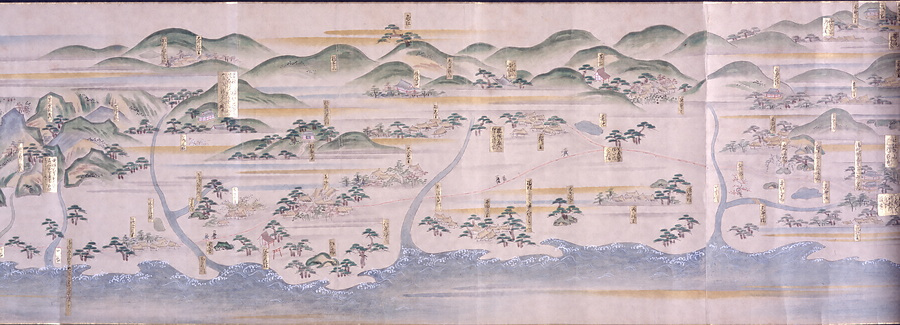 京都山崎の離宮八幡から高槻、伊丹、西宮、兵庫、須磨を経て、播磨国明石まで、西国海道の東端を描く図巻。街道筋は破線で示され、街道を通行する人物も複数描かれている。また、街道筋に沿って展開する町場や社寺、近傍の村落、名所・旧跡、川・池などが色彩豊かに描かれ、それぞれの名称が金紙に記されている。なかでも作者が特に重視するポイントには解説も付されており、情報量は多い。