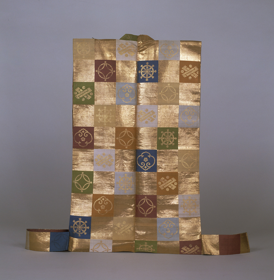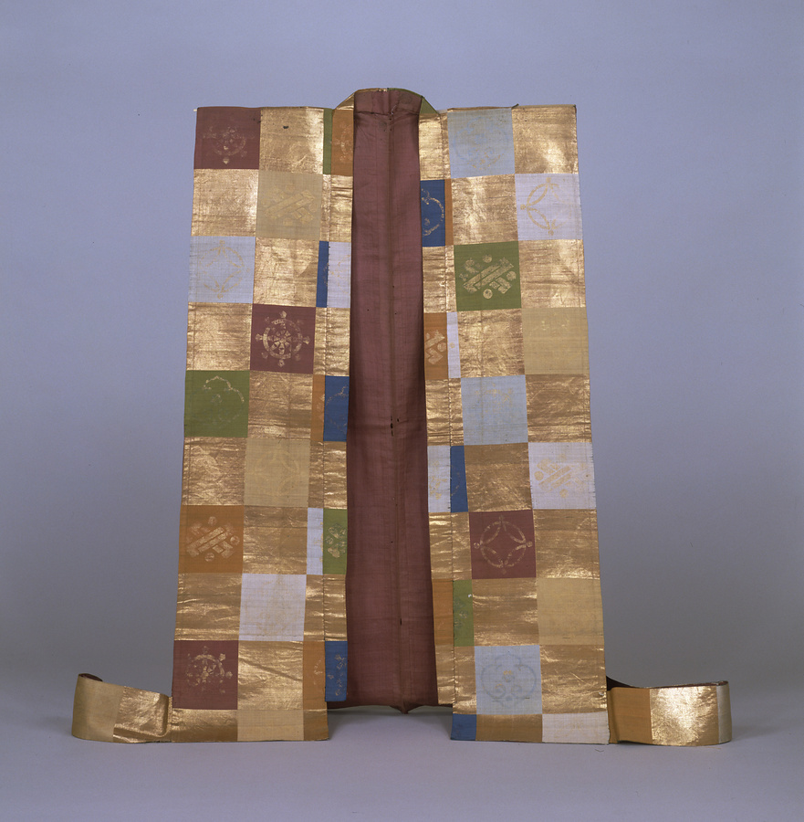 主として武士を演じる際に厚板の上に着る袖なしの能装束特有の形態です。能舞台では、実物の鎧@よろい@を使用するかわりに側次や法被@はっぴ@を使用します。勇ましい男性役にふさわしく、力強い石畳文を金糸で織り出し、雑宝の数々を表わした宝尽くしの模様を摺箔であらわします。