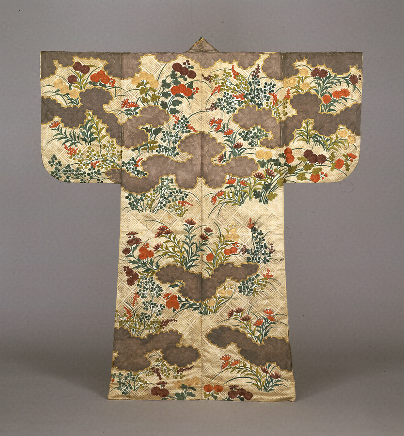 刺繡と金銀の箔で模様を表した小袖形の能装束。主に女性役が腰巻として使用するが、公達など風雅を好む男性役が着付として上着の下に着用する場合もある。金銀の刺繡糸で彩られた雲間に菊、萩、女郎花などの秋草を刺繡した縫箔は、落ち着いた中年女性のイメージ。