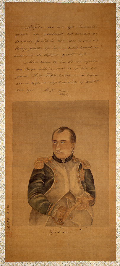 上部に書かれたオランダ語の文章は「ナポレオンが権威の欲望に迷い、数多くの殺伐とした戦いにおいて、自分の兵士のものと千人かの敵の住民を死者にしたため、暴君の名で呼ばなければならない。しかし死後にいわゆる神聖同盟が結ばれ、また兵学はその時以来に改善したため、ヨーロッパの解放者とも見なされても良い。」という意味です。これを記したH.K.Zunzirgとは細川潤次郎(1834ー1932)であると言われています。19世紀のはじめにヨーロッパを席巻したナポレオンについて、日本ではすこし時代が経ってから注目されるようになり、安政年間(1854-60)にはその伝記などが刊行されました。本図は、このようなナポレオンへの関心の高まりを背景にして描かれた作品でしょう。
