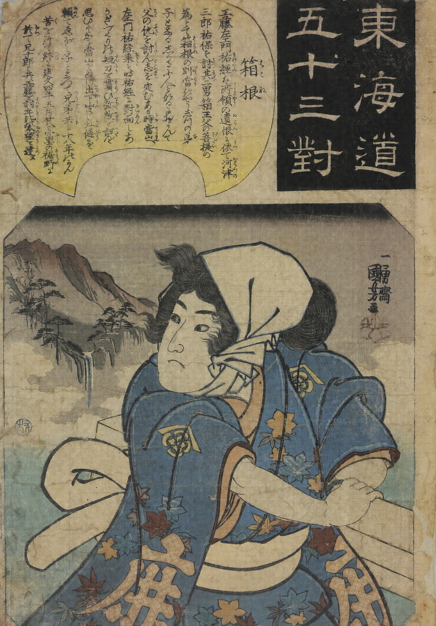 東海道の各駅に因んだ故事や物語を題材にした揃物で、箱根山を背に振り返る箱王丸が描かれています。仇討への決意を胸に箱根権現を後にした彼の表情に、その決意の強さが表現されています。脇に抱える木箱の中には、仇敵工藤祐経から贈られた赤木柄の短刀が収められているのでしょうか。