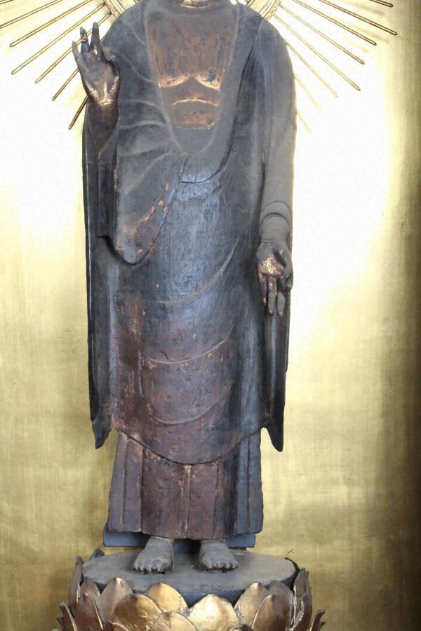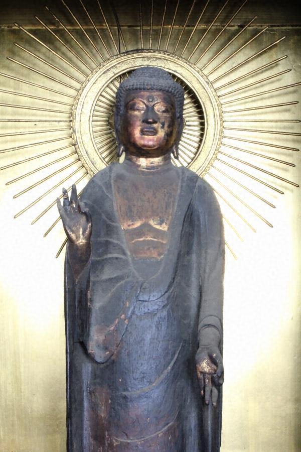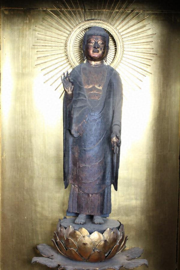 肉髻珠、螺髪。白毫は水晶製。彫眼、耳朶環状、三道を彫出する。衲衣、偏衫、裙を着け、右手は肘を曲げて掌を胸前に掲げ、掌を前に向けて第1・2指を捻じ、他指を軽く曲げる。左手は垂下して掌を前に向け、第1・2指を捻じ、他指を伸ばす(来迎印)。両足をやや開いて台座上に立つ。