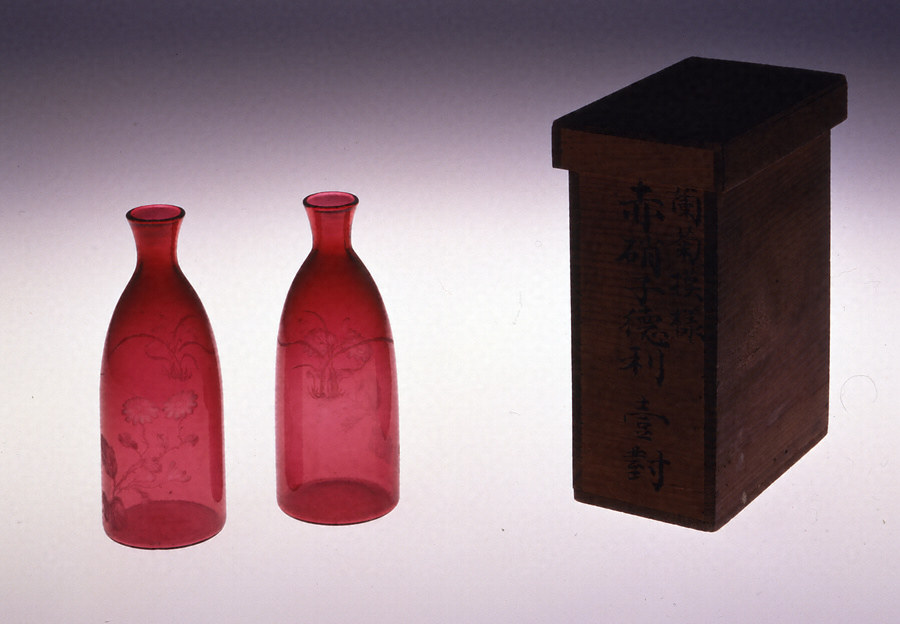 ガラスを発色させる着色剤に金を用いた、通称「金赤」のガラスを、無色のガラスに被せた(2層になっている状態)徳利。蘭と菊の装飾は、グラヴュールという工具を用いて施されています。この技法は、回転する円形の金属板(あるいは石版)にガラス器の表面を当てて、浅く削るようにして文様を施していきます。菊の葉をみると、葉全体を薄く、その後葉脈(ようみゃく)を深く削っていることがわかります。蘭の葉のしなやかに伸びる曲線が、巧みな彫りによって表わされています。