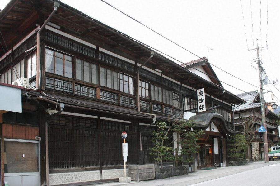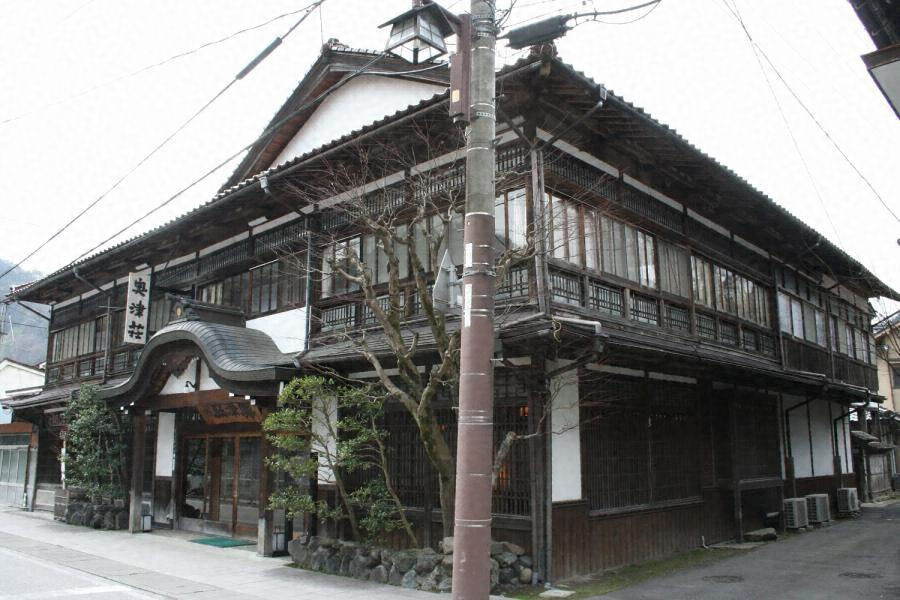 奥津温泉中心部にある旅館で、街路に東面して建つ。木造総二階建、入母屋造桟瓦葺で棟を矩折れに配し、正面北端の唐破風の玄関上に大屋根の妻面を重ねる。一階全面に並んだ格子や出桁造の深い軒など立体感のある外観で、温泉街の歴史的景観の核をなしている。