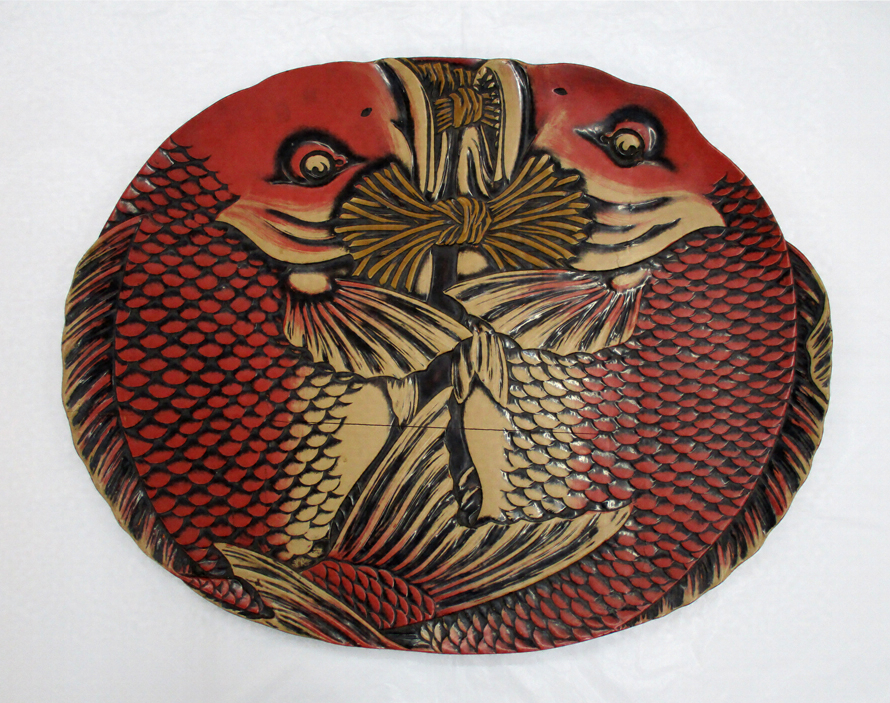 高岡漆器の代表作品の一つ。2匹の鯛が向かい合って抱き合う姿。デザインは富山県工芸学校(1894年開校/現県立高岡工芸高校)初代校長・納富介次郎、彫刻は同校教頭の村上九郎作(高岡彫刻塗の祖)と伝わる。後に、挽物木地に1匹の鯛を円形に配したものとなり、数多く生産されることとなった。漆器業界に大きな影響を与えた作品である。