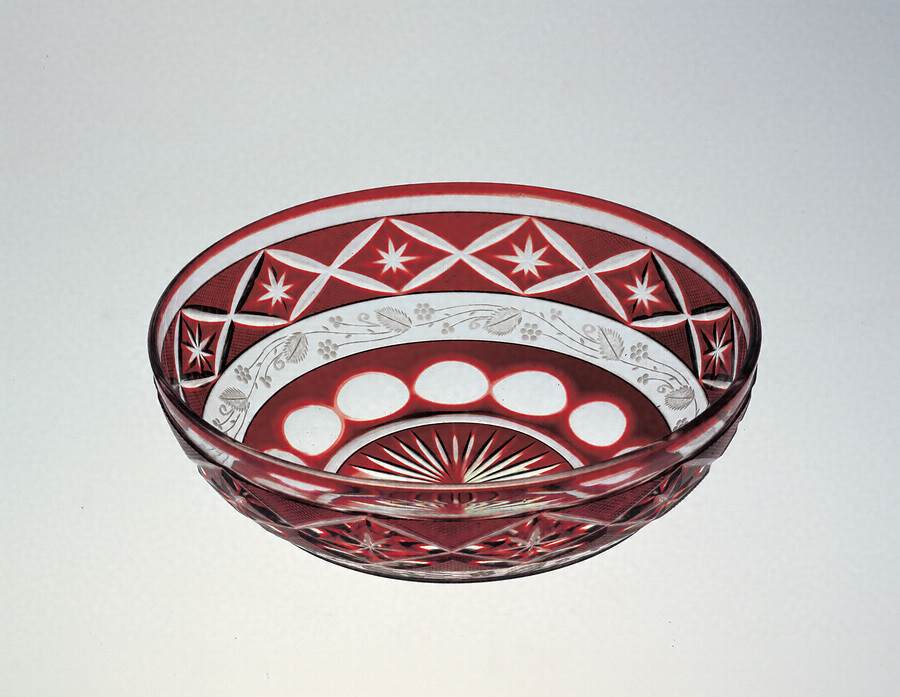 手彫り切子銅赤色被せ剣菊/円・格子に菊文グラヴュール唐草文ガラス鉢