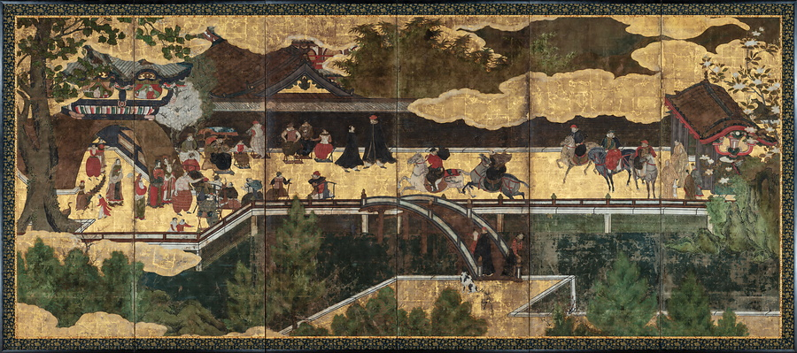 左隻には異国の風俗を、右隻には日本に到着した南蛮船と上陸する南蛮人一行を描いており、伝狩野山楽筆「南蛮屏風」(重要文化財、サントリー美術館蔵)の図様を継承した作例とわかります。とりわけ注目すべきは左隻の描写で、中国風の異国の楼閣では、2階の窓に女性と子供の姿が見えます。1階には着飾った女性たちや、孔雀と戯れる子供も描かれています。塀と欄干に挟まれた細長い道には、南蛮人男性が椅子に腰掛けていますが、天蓋のある椅子に座る男性がカピタン・モールと考えられます。彼の元には右方からアラビア馬に乗る2名の南蛮人が駆けてきます。欄干で区切られた細長い道を馬で駆けていくさまは、京都・上賀茂神社の神事を描いた「賀茂競馬図屏風」を想起させるものです。南蛮人たちに神事の図様を用いることで、宗教性を加味した可能性があります。松樹や桐樹などの装飾的な枝振りからは、長谷川派系の画家の作と考えられます。