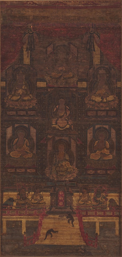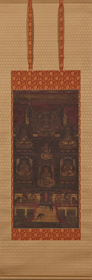 比叡山に鎮座する神々を仏の姿を借りて描いたもの。釈迦如来(大宮@おおみや@)を中心に千手観音、十一面観音、薬師如来、地蔵菩薩、阿弥陀如来、普賢菩薩が時計回りに表されます。山王二十一社のうちの上七社です。階段には神の使いである猿が描かれ、供物@くもつ@をお供えして戻っています。
