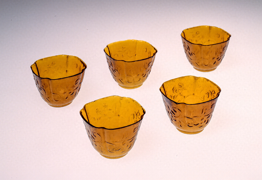 四方の腰部に唐草文を施し、四隅に切込みが入った「隅切り」形の向付です。くっきりと浮き出た唐草文は、透かし彫りを施した型にガラスを吹き込んで成形されたのでしょう。口縁は研磨処理されていますが、欠けが生じているものも含まれています。琥珀のような黄色いガラスは、鉄を混ぜることで発色しています。