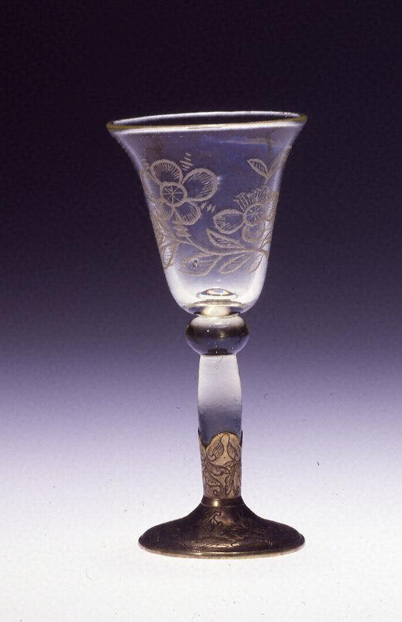 鏨石(たがねいし)をつけた棒状工具で、ガラスの表面(ひょうめん)を引っ掻くようにして加飾する“ぎやまん彫り”によって、梅の花が刻まれた脚付き杯。花脈や葉脈などの細部まで表されています。脚の球状の装飾は、西洋製の脚付杯を参考にしたのでしょう。