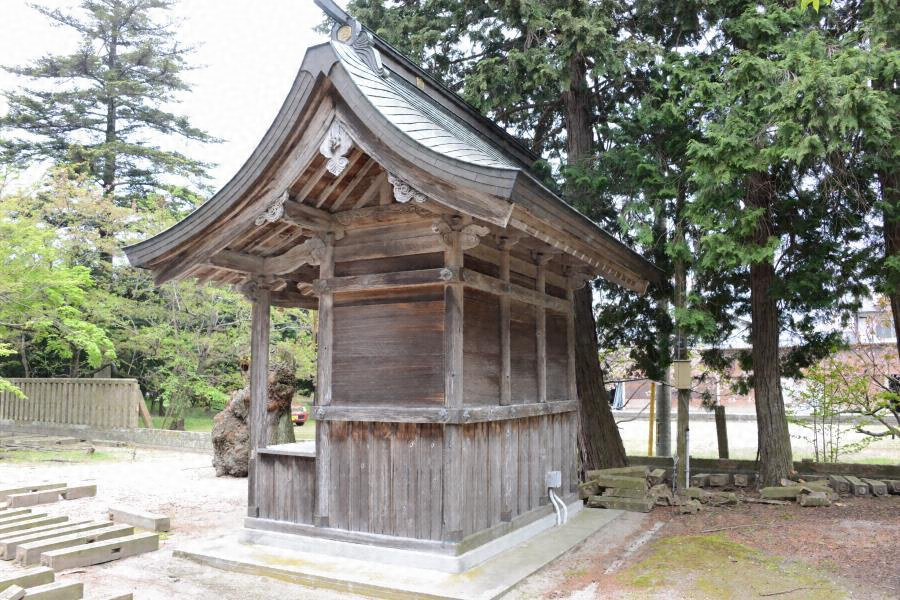 境内後方にあり、本殿西側に南面して建つ。三間社流見世棚造で、前後とも一軒疎垂木、妻飾は虹梁大瓶束、破風拝みに蕪懸魚を飾る。身舎と向拝は海老虹梁でつなぎ、向拝両端の柱を虹梁型頭貫で結ぶ。伝統的な境内空間を構成する、端正な意匠の境内社である。