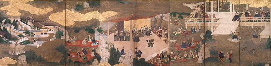 本図は従来、天正16年(1588)に秀吉が後陽成天皇を招いた聚楽第行幸の情景と考えられてきました。しかし、能楽研究の立場から、天正13年の秀吉関白叙任祝賀能、あるいは文禄2年(1593)の禁中能のいずれかに比定されています。禁中の舞台では翁が演じられており、紫宸殿の御簾の奥にいる衣冠姿の人物が後陽成天皇、その右手の縁側で扇を広げる男性が秀吉と考えられます。観客には日本人の男女だけでなく、南蛮人の姿もあり、長い煙管を吸う従者の姿がとりわけ目をひきます。左端にある北野社は慶長12年(1607)の豊臣秀頼による復興後の景観を示しています。能を愛好し、南蛮に関心を抱いた秀吉を追慕する画題といえるでしょう。
