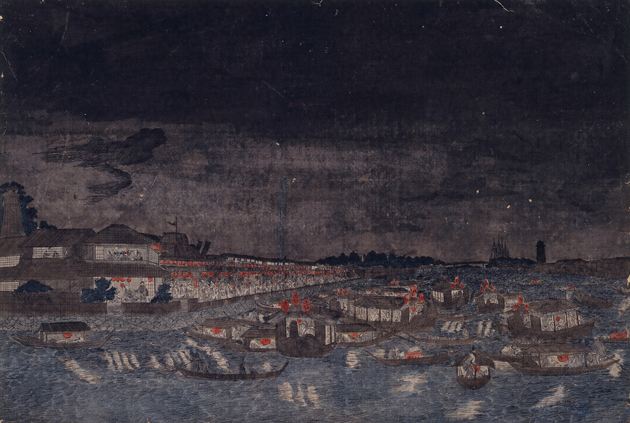 司馬江漢が天明年間(1781-1789)に制作した風景銅版画のひとつ。中洲とは、隅田川の西岸、新大橋の南方につくられた埋立地で、寛政年間(1789-1801)に撤去されるまで納涼地・岡場所として栄えました。俗に三叉とも言われ、浮世絵版画では夕涼みの夜景として描かれた場所でした。江漢の銅版画は眼鏡絵として描かれたので、隅田川上流からの眺めということになります。遠くに見えるのは永代橋です。