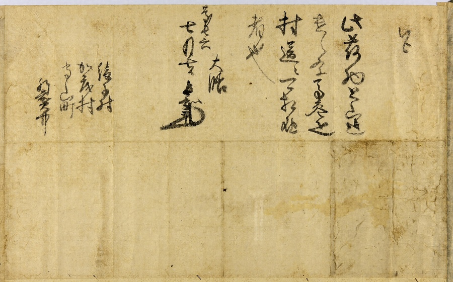 前田利長の側近・横山長知がおそらく自分の知行地と思われる町村に対し、荷物を富山まで運ぶように、また馬三匹で村送りに届けよと指示している。綾子村は現小矢部市、加茂村は現高岡市福岡。