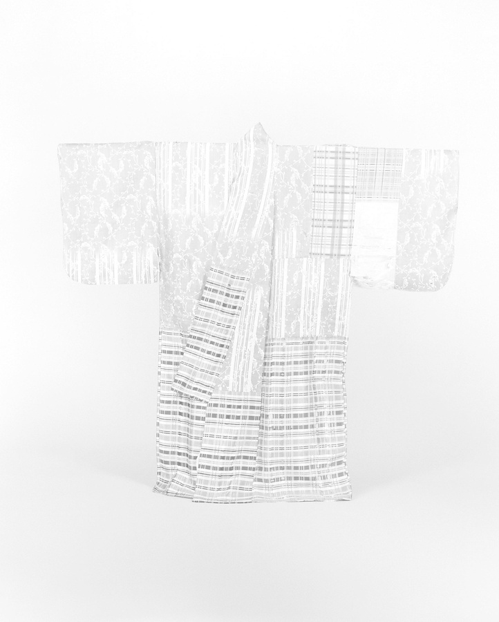 経糸(たていと)を萌黄と紫に染め分け、浮織で雪持柳模様を表わし、紫地にはさらに白い経糸で縞だてをして変化をつけている。格子模様の一部は江戸時代後期のものであるが、安土桃山時代の厚板地を仕立替しながら大切に用いたことがうかがえる。