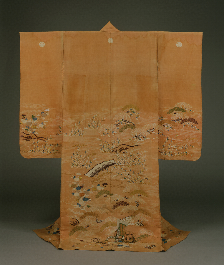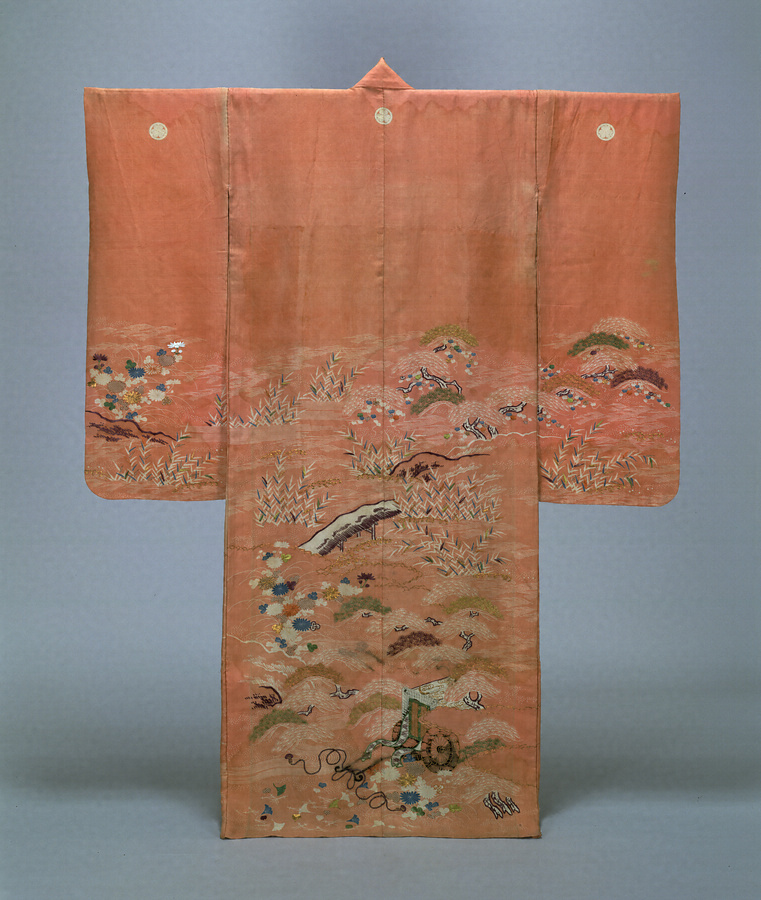 絽を紅で染め、未婚の若い女性用として振袖に仕立てられた夏の衣料である。江戸時代後期の武家女性の様式的な風景模様がデザインされた腰模様となっている。家紋が白上がりで染め抜かれている点もまた、武家女性の服飾の特徴の1つである。