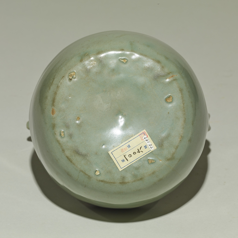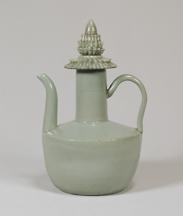 稜が立った胴部、筒状に伸びた口部、把手や蓋の鈕の形状などに、金属器の造形の影響が色濃くあらわれています。一方、底部は平らで、6つの小さな硅石目(けいせきめ)がみられ、中国北宋時代末の汝窯(じょよう)青磁の影響を受けていることがわかります。