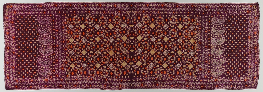 薄く軽やかな絹地に、ペイズリー文様を絞りで鮮やかに染め分けます。シボの残る文様の輪郭線には、いたるところに針孔【はりあな】が空いており、針と糸を用いた縫い締め絞りとわかります。20世紀初頭の写真から、パレンバンの女性が絞りのショールをまとっていた様子がわかります。