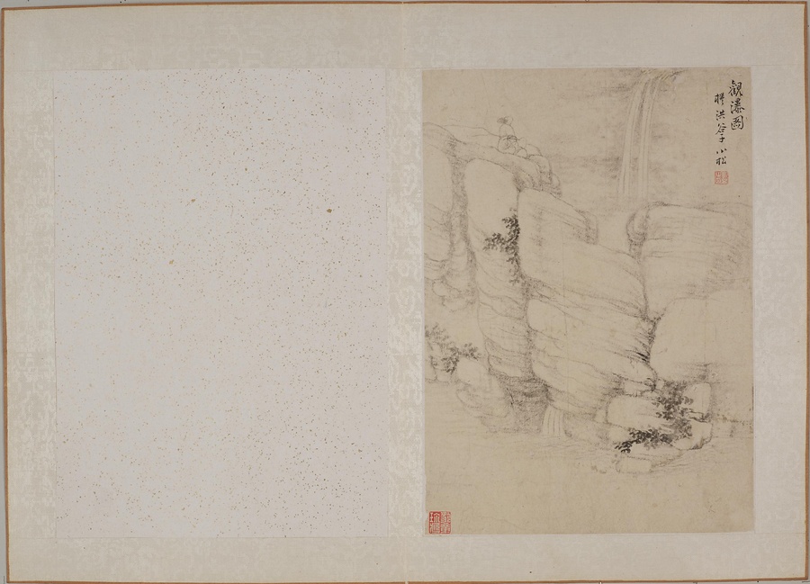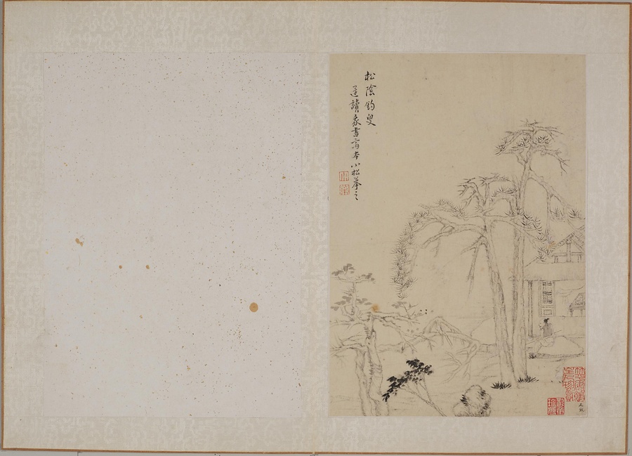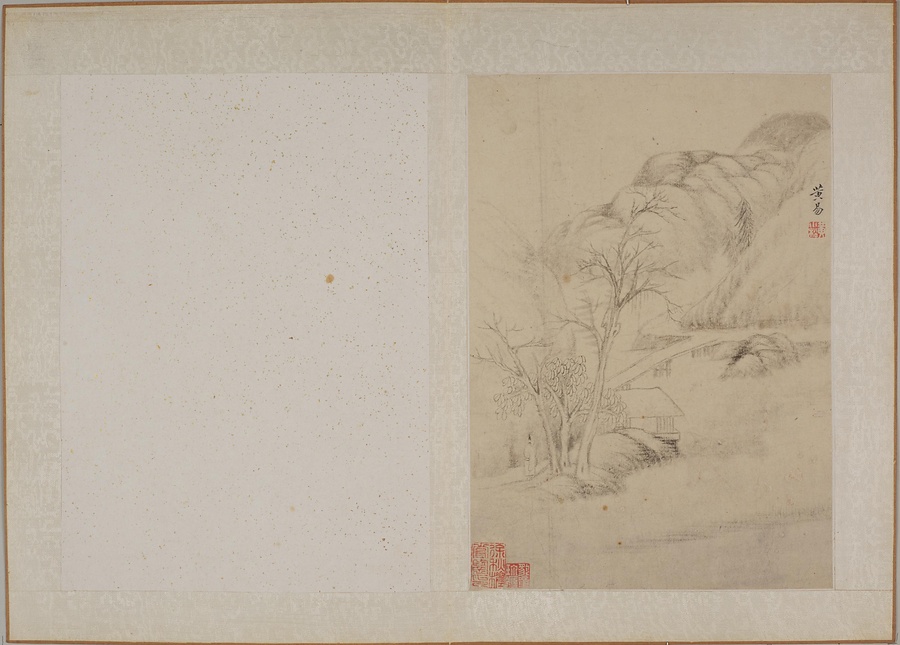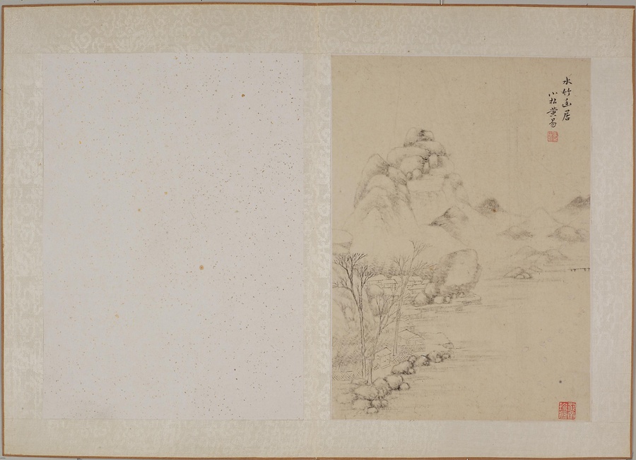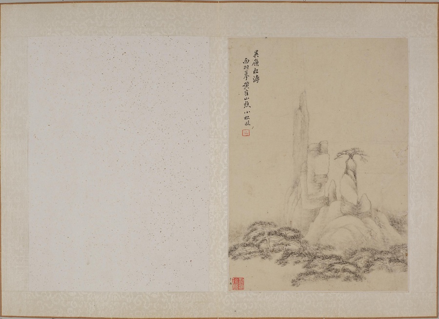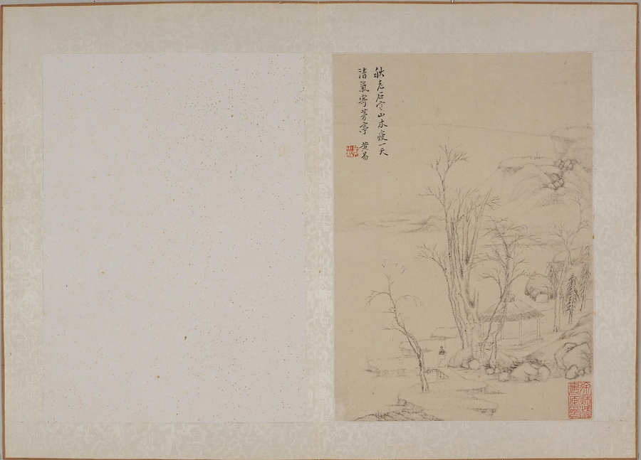 黄易は書画と篆刻に優れた、清@しん@時代後期を代表する文人です。本作は、明@みん@時代末期の安徽@あんき@地方の画家である丁雲鵬(1547~1628)による「白描山水小冊@はくびょうさんすいしょうさつ@」に想を得て作った画冊です。丁雲鵬が倪瓉に倣った図を黄易が模写したという図があります。
