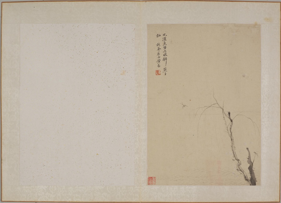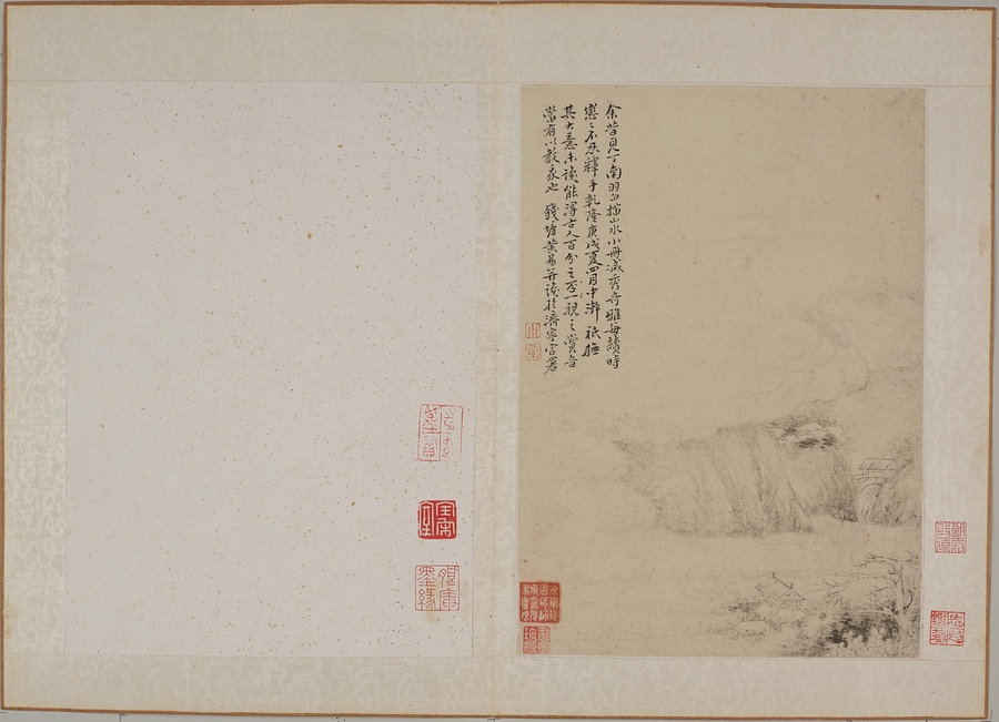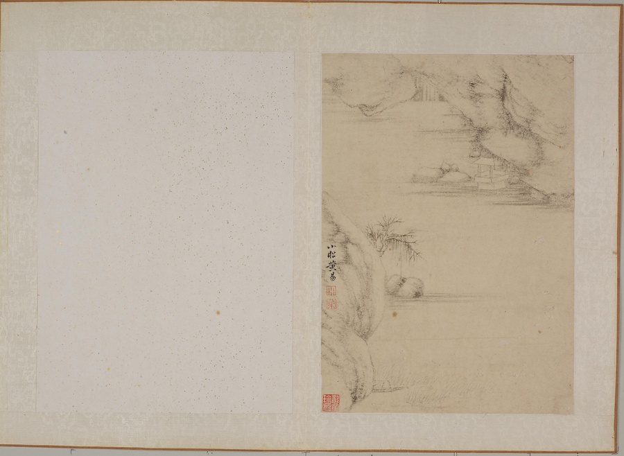 銘文:第一図 梅竹山居、小松黄易寫 ; 鈐印「易」 ; 第二図 水漲魚笛上、風斜燕子栖、秋菴居士黄易 ; 鈐印「黄小松」 ; 第三図 松陰釣叟、■読■書寫本、小松模之 ; 鈐印「小」 ; 松 ; 第四図 黄易 ; 鈐印「黄小松」 ; 第五図 雲鵬仿迂老筆、小松臨 ; 鈐印「易」 ; 第六図 観瀑布、摸洪谷子、小松 ; 鈐印「黄易之印」 ; 第七図 異嶺松濤、南羽仿黄鶴山樵、小松臨 ; 鈐印「易」 ; 第八図 水竹幽居、小松黄易 ; 鈐印「黄易之印」 ; 第九図 秋老石空山木痩、一天清気寄茅亭、黄易 ; 鈐印「黄小松」 ; 第十図 小松黄易 ; 鈐印「小」 ; 松 ; 第十一図 法九龍山人、秋菴居士黄易 ; 鈐印「黄小松」 ; 余昔見丁南羽白描山水小冊、減秀奇雅、毎読時戀戀不忍釋手、乾隆庚戌夏四月中潮、祇撫其大意、未識能得古人百兮之否一視之賞音當有以教家也、銭塘黄易并識於濟寧官署 ; 鈐印「小」 ; 松 ; 鑑蔵印「豹章珍藏」 ; 竿安館主人珍賞 ; 徐秋槎賞鍳印 ; 徐秋槎書畫印 ; 朗盦七十以後所得 ; 朗庵墨縁 ; 朗庵収藏 ; 寶宋室 ; 定静堂収藏印 ; 志超鑑賞 ; 志超鑑藏