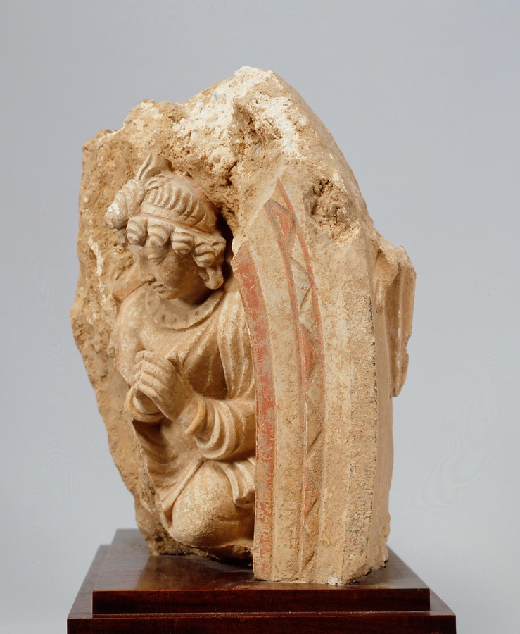 ガンダーラの寺院に造営された仏塔や祀堂(しどう)は石造建築で、表面に漆喰を用いて仕上げます。壁面には片岩あるいはストゥッコ(漆喰)によるさまざまな意匠の浮彫彫刻を貼りつけて飾られました。