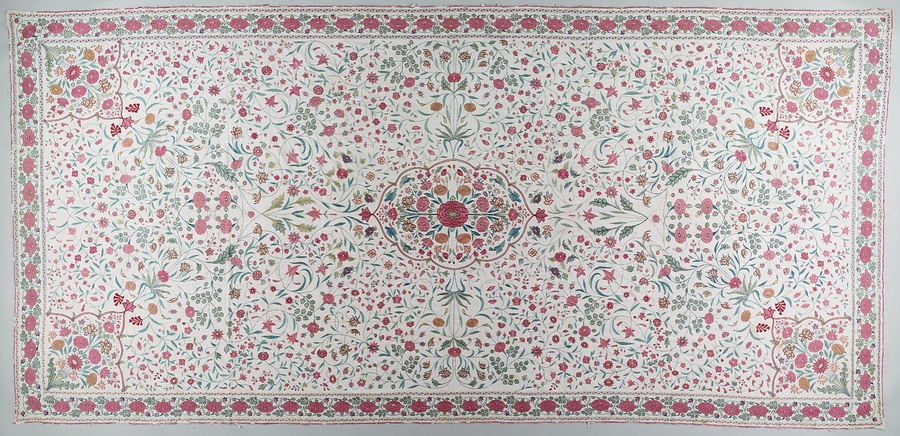 黒色の下描きをもとに、薄手の木綿地に絹糸で密に刺繡を施した敷物です。文様はすべて鎖繡(チェーンステッチ)で表され、一針は1mmほどの細かさです。可憐な花文様と色遣いから、18世紀のヨーロッパの好みに沿って製作されたことがうかがえます。